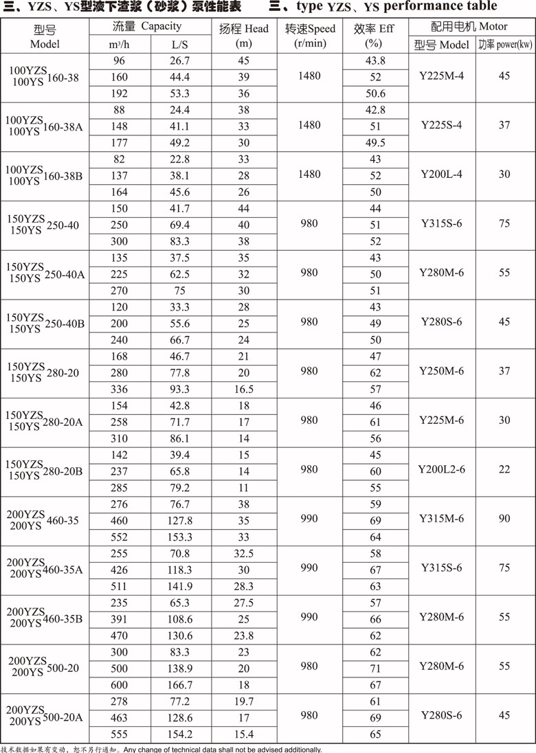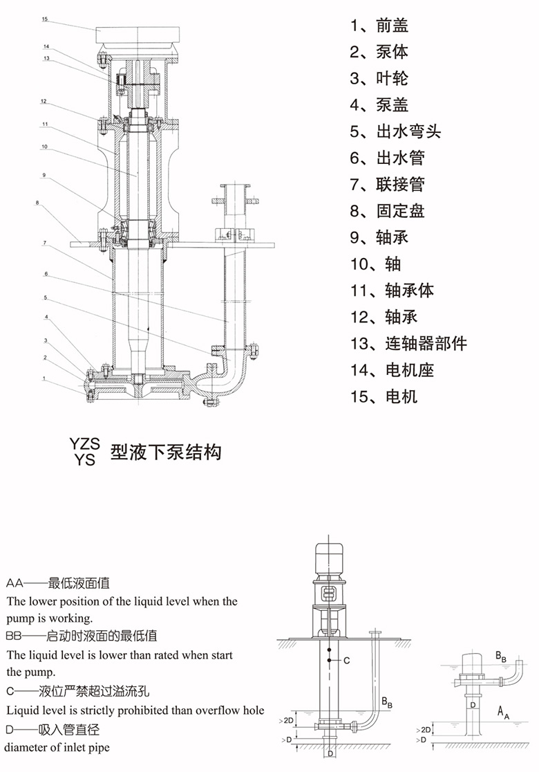 YS-YZS型泵為單級,單吸懸臂式結(jié)構(gòu),用軸承座,支承座,聯(lián)接管連接泵的水力部件,液體由出液管部件排出,泵的葉輪為半開式葉輪,在葉輪葉片進(jìn)口延伸處設(shè)有攪拌葉片,該泵主要特點是在液下部位的泵軸,有足夠的剛度,葉輪,泵殼之間不設(shè)軸承,不采用軸封,可以輸送含有較大濃度固體顆粒的介質(zhì)。泵插入液下長度在 800MM-3000MM之間,如果需要可以配帶吸入管。軸封采用液下泵插入液體中運行,不設(shè)軸封,傳動由立式電動機安裝在電機支承和支承座上,用聯(lián)軸器與泵相連。